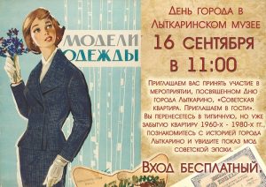 Приглашаем всех желающих 16 сентября в 11:00 на мероприятие «Советская квартира. Приглашаем в гости», посвященное Дню города Лыткарино. Вы перенесетесь в типичную, но уже забытую квартиру 1960-1980-х гг., познакомитесь с историей города Лыткарино и увидите показ мод советской эпохи. Также в течение дня, с 10:00 до 17:00, для вас будет работать выставка «Мой адрес — Советский Союз» для самостоятельного осмотра. Вход бесплатный.