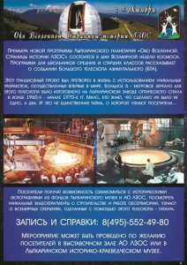 Мероприятие Лыткаринского планетария «Око Вселенной. Страницы истории ЛЗОС.» зарегистрировано на официальном сайте Всемирной недели космоса—2017 среди 20 участников от России. Тема недели в этом году — «Изучая глубины Вселенной в космосе». Программа из Лыткарино рассказывает о самой крупной обсерватории в России — Специальной астрофизической обсерватории РАН. В создании главного инструмента для нее, Большого телескопа азимутального, принимал непосредственное участие Лыткаринский завод оптического стекла. С помощью БТА астрономами были сделаны важные открытия, некоторые из которых пока еще остаются загадкой и не имеют объяснения с точки зрения сегодняшней науки.