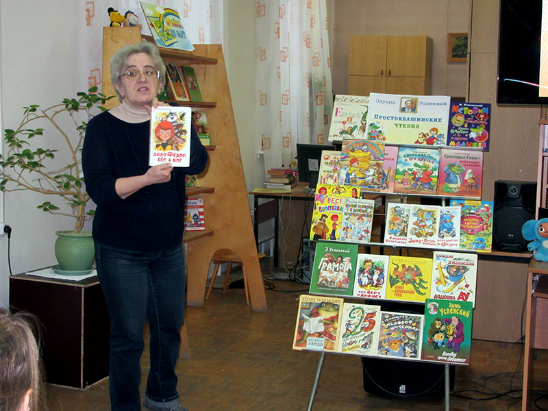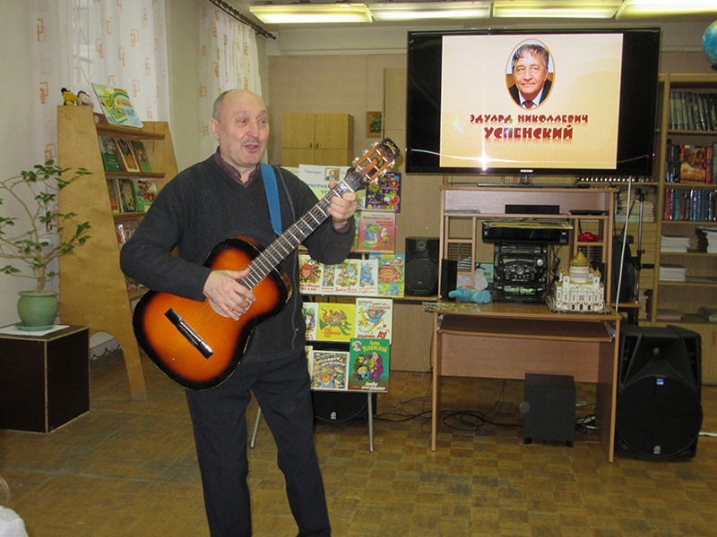 На мероприятие были приглашены учащиеся 2 «В» класса гимназии №1. Школьникам рассказали о том, как Успенский стал писать книги и как появились его знаменитые персонажи: Чебурашка, крокодил Гена, дядя Фёдор, кот Матроскин, пёс Шарик и другие. Ребята читали стихи Э.Н. Успенског и отвечали на вопросы литературной викторины по произведениям писателя. А потом вместе с руководителем музыкального клуба «Аккорд» Е. Л. Зениным пели песни «Голубой вагон» и «Чебурашка». В конце мероприятия был показан мультфильм «Зима в Простоквашине».