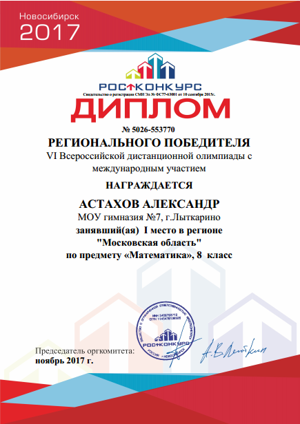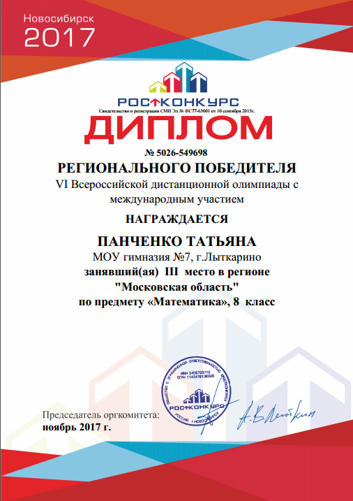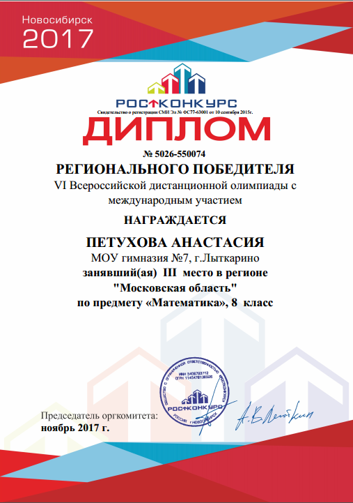 Подведены итоги VI Всероссийской дистанционной олимпиаде по математике с международным участием,в которой приняли участие учащиеся 8 «А» класса МОУ гимназии №7. И вот долгожданные результаты! Здорово.Молодцы. Поздравляем с победой.
