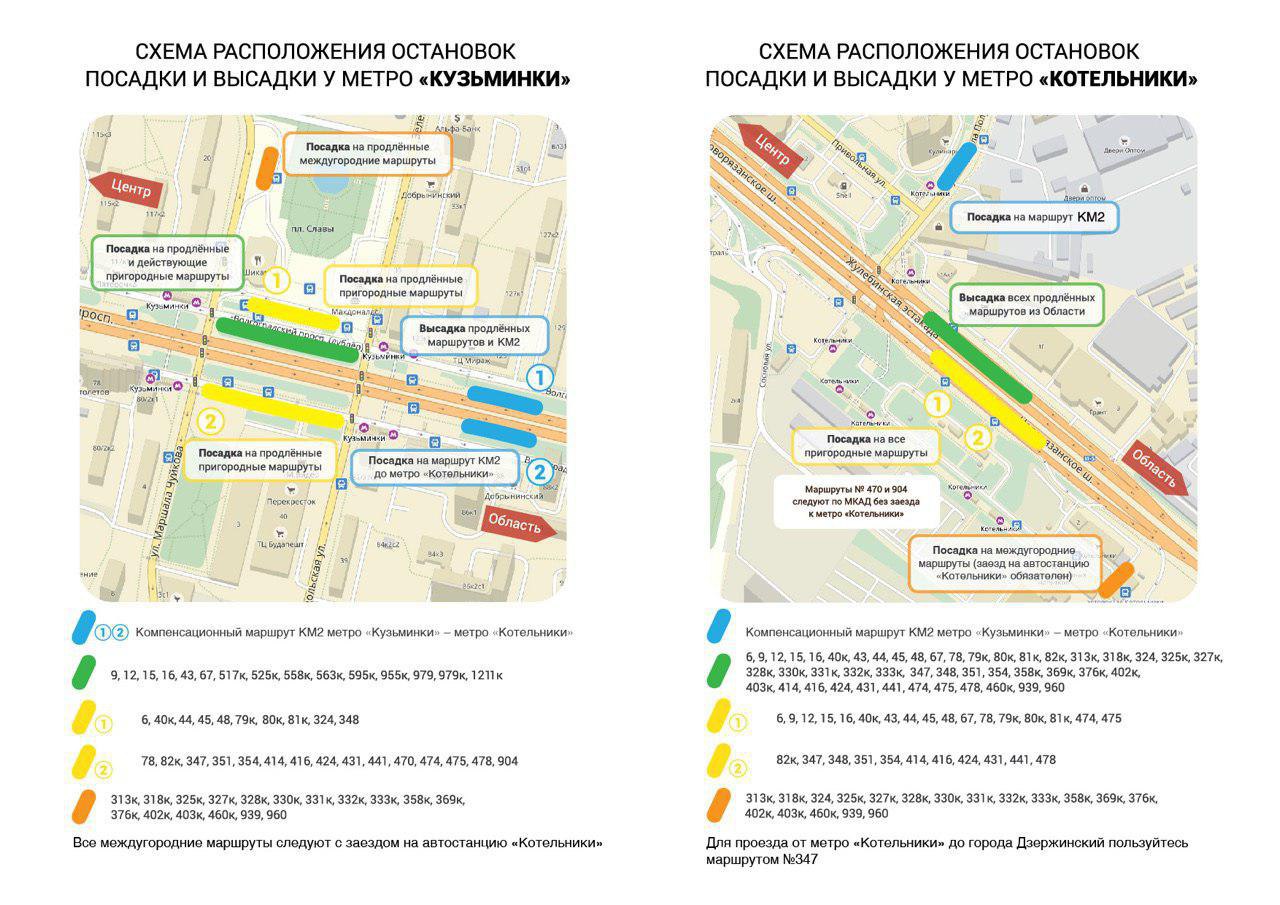 Автобусы будут перевозить пассажиров до станции «Кузьминки», а не до станции «Котельники», как это было ранее. Все маршруты, имеющие промежуточную остановку у метро «Котельники», сохраняют прежний путь следования.
