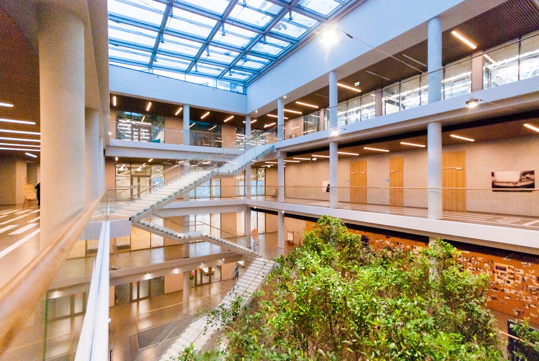 Сказочный облик дополняют огромные фикусы, вырастающие в центре этого огромного атриума. Для их корневой системы в полуподземном этаже предусмотрены подвешенные на перекрытиях бетонные «кадки», глубиной 2 м и диаметром 2,5 м, а также система полива и дренажа. Образ фантастического леса прослеживается и в облицовке фасада: крупная решетка скрещенных под разными углами тонких бетонных балок, похожих на укрупненное стилизованное изображение древесных ветвей. Архитекторы разместили его перед панорамными витражами и подчинили наклонным линиям контуры окон, а кое-где – даже наклон опор за стеклами, задав таким образом фасадам общий танцующий ритм.