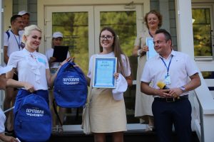 Почта России совместно с Артеком наградили 13 лидеров программы «Дверь синего цвета», ребят в возрасте от 14 до 18 лет. Они приехали в Крым из 11 субъектов Российской Федерации по бесплатным путевкам, предоставленным им в рамках соглашения между Артеком и Почтой России. Ребята прошли серьезный отбор, показав высокие результаты в организации почтового обмена между лагерями Артека и став, по сути, самыми успешными сотрудниками единственной в мире детской почты – Почты Артека. Общее количество уникальных почтовых отправлений (открыток и писем, созданных Почтой России исключительно для Артека и отправляемых друг другу артековцами), обработанных ими за смену, составило 14 158 шт.