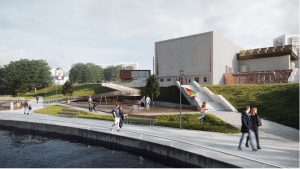На месте фонтана, который был между кинотеатром и детской площадкой, разместят пешеходный («сухой») фонтан – струи воды будут бить прямо из мостовой. При этом она будет с уклоном, в конце которого будет углубление для скопления воды. А возле этого углубления разместят скамейки, сидя на которых, можно будет помочить ноги. Рядом с фонтаном построят специальную детскую площадку «Ручей» для игры с водой. На ней будут несколько каналов и динамическое оборудование для управления струями и подсветкой, а также дамбы, заслонки, помпы, водяное колесо и водяная спираль. Отметим, что похожую площадку для игры с водой впервые открыли в Парке Горького в 2018 году. Вокруг фонтана и площадки «Ручей» разместят множество скамеек и столов для игры в шахматы.