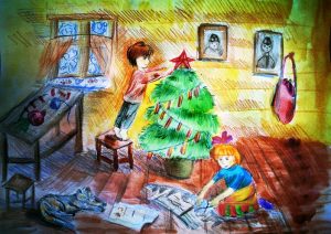 10 лучших работ будут использованы для создания коллекционной серии новогодних открыток. Эксклюзивные почтовые карточки Почта России выпустит в декабре этого года. В первую очередь открытки получат победители конкурса и ветераны Великой Отечественной войны, которых дети сами поздравят с Новым годом. 10 ноября завершился прием работ на Всероссийский детский конкурс «Нарисуй Ёлку Победы». Его организаторами стали Музей Победы, Почта России и благотворительный фонд Оксаны Федоровой «Спешите делать добро!». Творческое состязание проходило с 10 октября. Свои работы прислали более 1100 юных художников от 7 до 17 лет из 59 регионов России, а также Испании, Италии, Канады, Республики Беларусь, Турции, Франции, Швеции. Самыми активными участниками стали школьники из Москвы, Московской, Вологодской, Пензенской областей, Республики Удмуртия, Республики Саха (Якутия) и других регионов. В конкурсе участвовали семьями и классами. Коллективные заявки приходили от школ искусств и творческих художественных студий. Большинство участников не ограничились просто рисунками, а прислали рассказы-воспоминания своих бабушек и дедушек о том, как проходило празднование Нового года в военное время. «Моя прабабушка Люба смутно помнит Новый 1945 год, ей тогда было 6 лет. Помнит сильный голод и холод, жила с мамой в деревянном бараке. Перед Новым годом ее мама варила свеклу, нарезала длинными брусочками и вместе нанизывали их на нитку. Получалась праздничная гирлянда, которую после праздника съедали», — поделилась своими впечатлениями 10-летняя Екатерина Умрихина из Благовещенска. «Моя бабушка Надежда Константиновна вспомнила, как ее папа (он всю войну работал в угольной шахте) принес из лесу маленькую елочку и поставил в ведерко с песком. Еще он принес немного помятые листы бледной цветной бумаги, из которых аккуратно вырезали маленькие флажки. Флажки клеили на веревочку. Так они украсили елочку и комнату, где она стояла», — написала 11-летняя Арина Юнжакова из Московской области. «На тот момент, когда началась война, моей прабабушке было всего 11 лет. Она работала в тылу, шила маскировочные халаты для фронта. Жила моя прабабушка в деревне, жили они очень бедно. Новогоднюю елку чаще всего наряжали около школы.