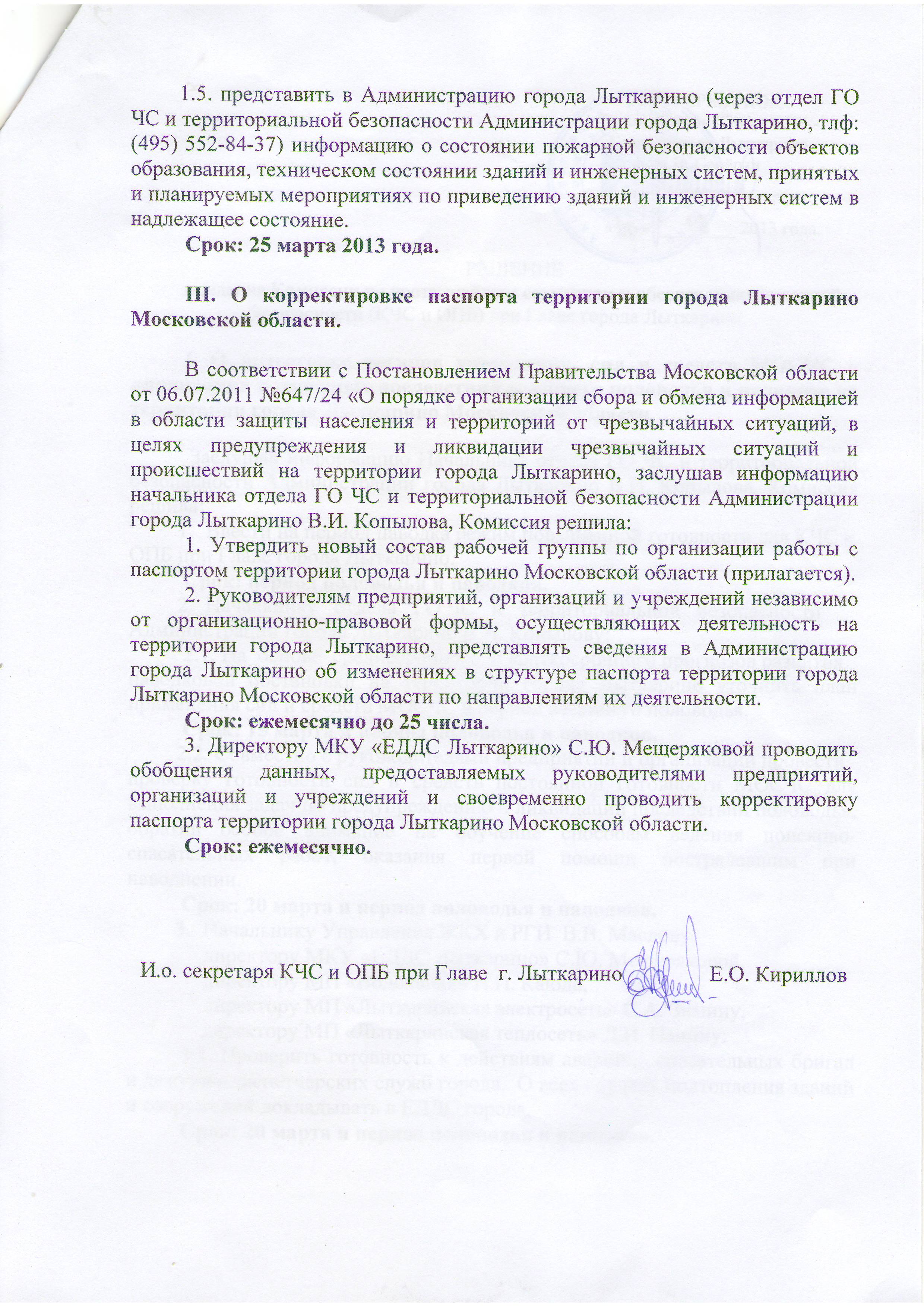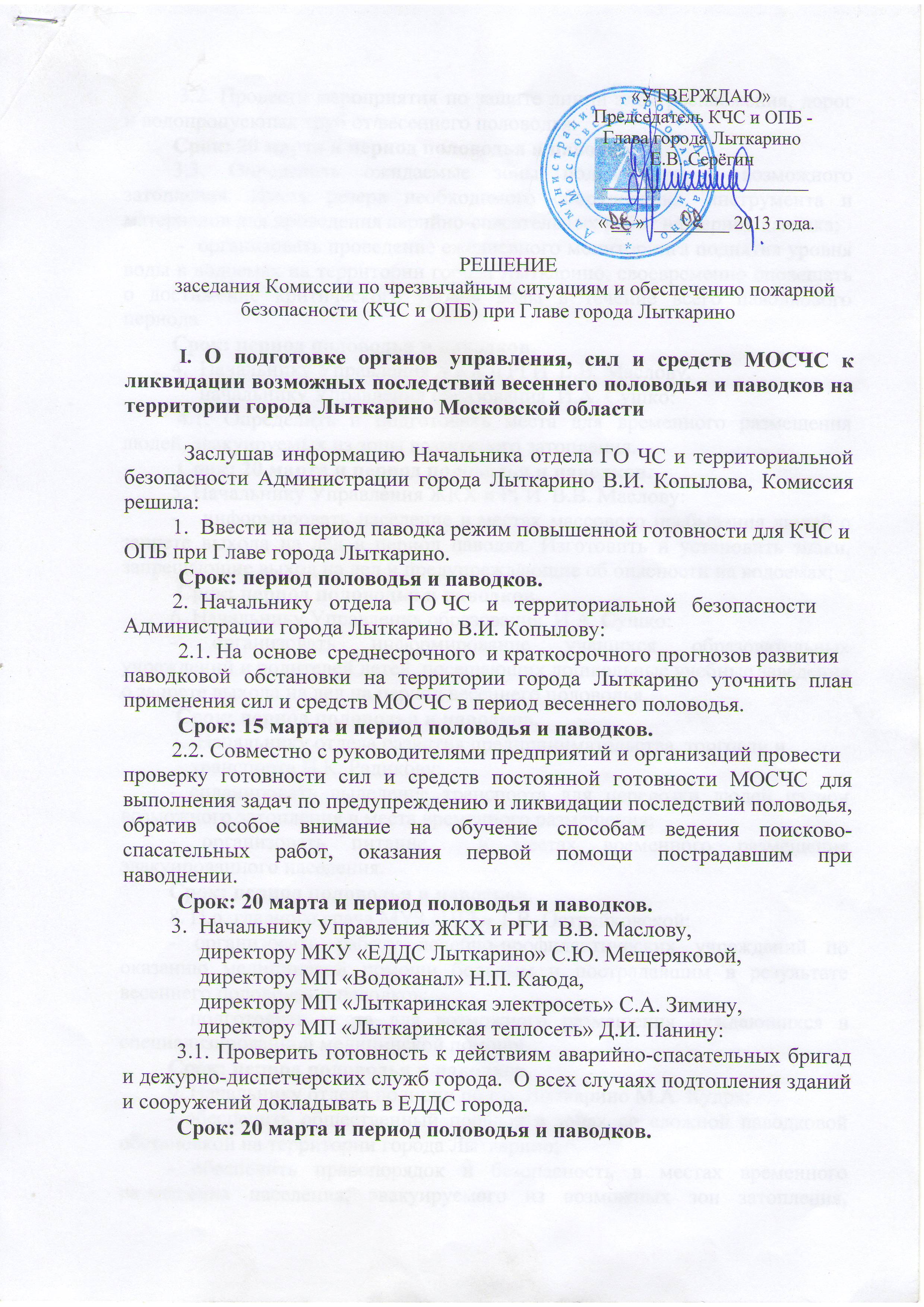 РЕШЕНИЕ от 28 февраля 2013 года заседания Комиссии по чрезвычайным ситуациям и обеспечению пожарной безопасности (КЧС и ОПБ) при Главе города Лыткарино